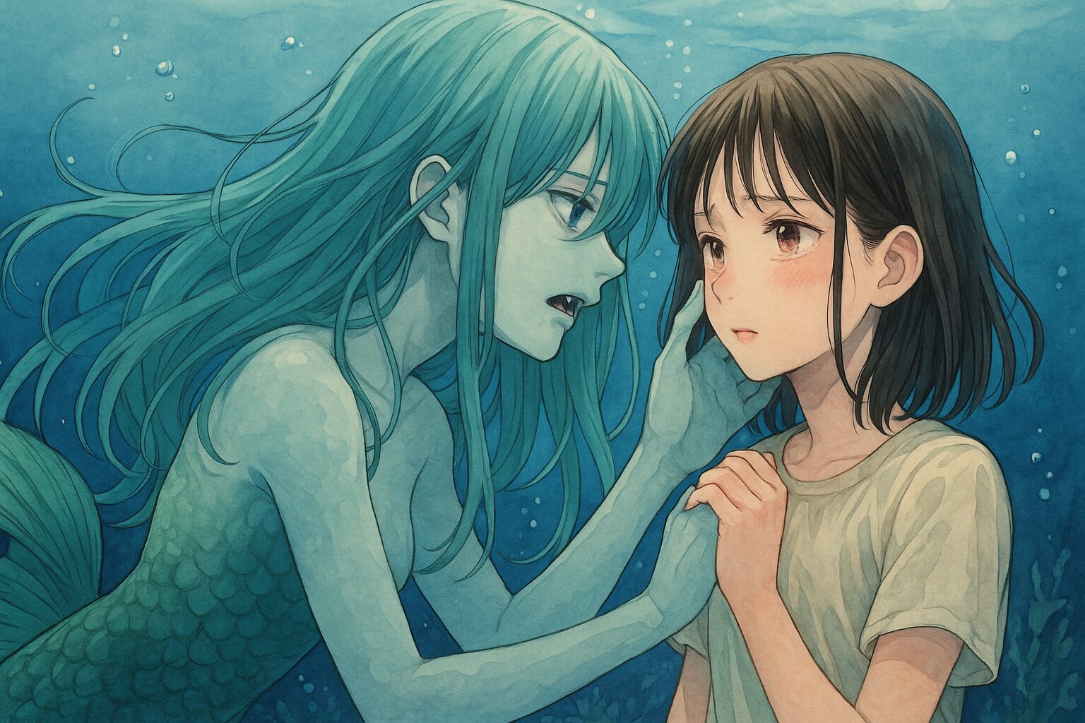 “人魚”というモチーフは昔から存在しますが、『私を喰べたい、ひとでなし』における汐莉の人魚は、伝承のどれとも違う独特のニュアンスを持っています。一般的な人魚は「歌で人を惑わす」「海に引きずり込む」といった“死の誘惑”側の象徴として語られることが多いけれど、汐莉はもっと食欲に近い、もっと本能的な“生物としての欲望”を抱えている。そのうえで彼女は比名子を守る。捕食者なのに、保護者。ここが信じられないほど魅力的なんです。