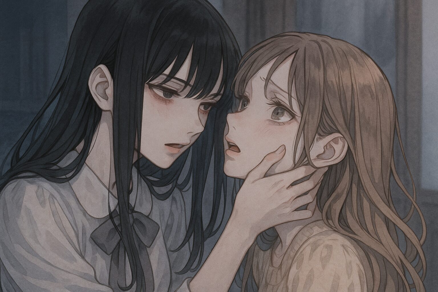 耽美って、綺麗だけじゃ成立しない。そこに“壊れる危うさ”が混ざって初めて耽美になる。線が細いのに表情は重く、瞳だけがやけに湿っている──そんなアンバランスさが読者の神経を刺す。わたたべの比名子と汐莉の表情にも、あのアンバランスが確かに宿っている。特に比名子の伏し目がちな表情は、絵としての“静けさ”が強いのに、感情の奥には耐えきれない重さが沈んでいる。この二層構造が、耽美系ダーク百合の絵柄を語る上で避けられない魅力なんです。