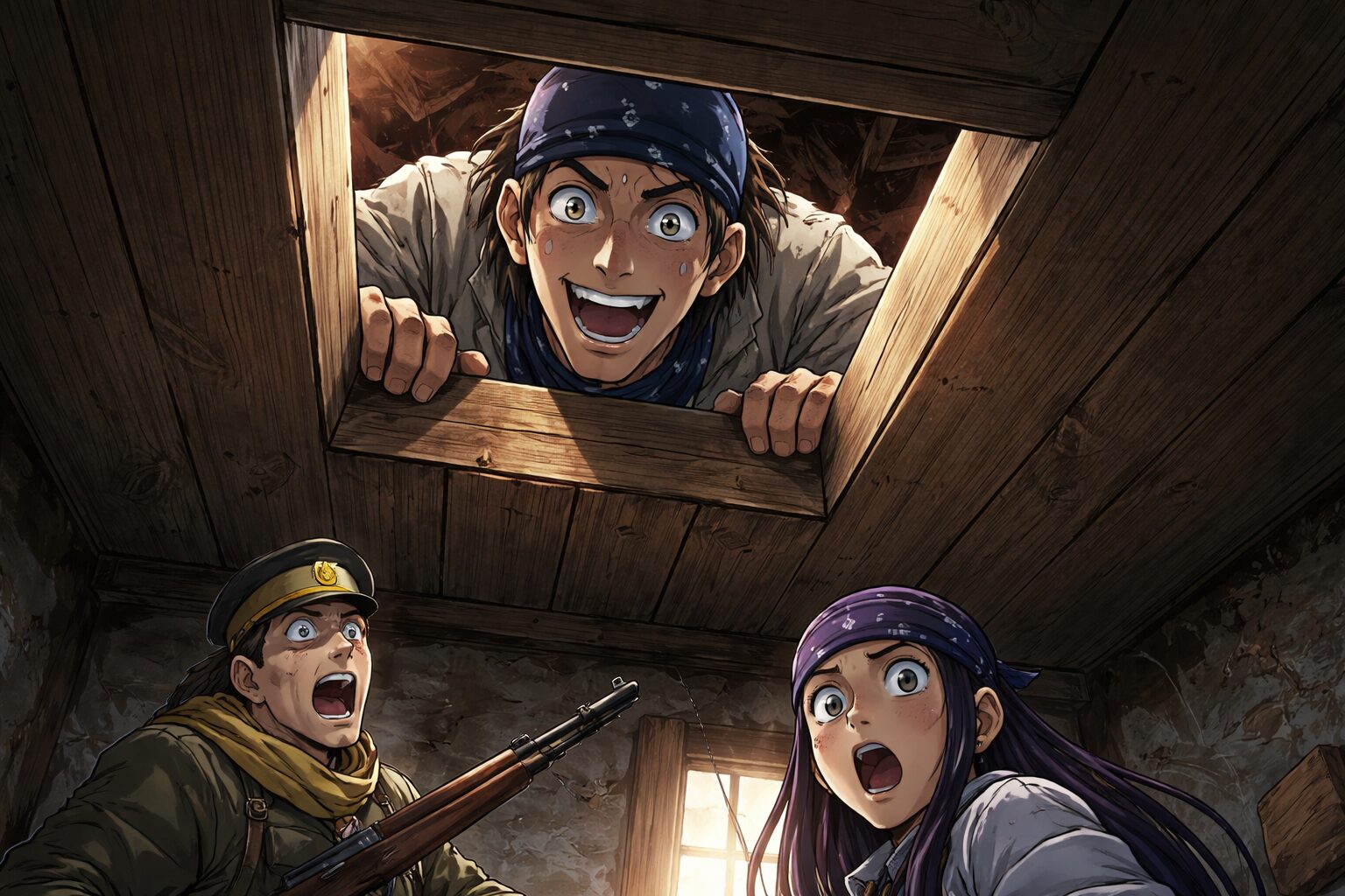- 『ゴールデンカムイ』の天井シーンは、ただのギャグではなく「安心を壊す装置」として強烈に機能していることがわかる