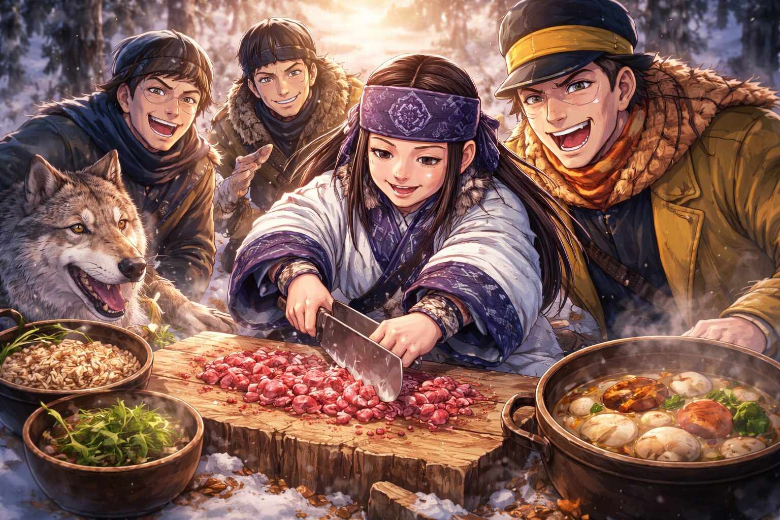 個人的に面白いなと感じたのは、チタタプの場面を思い出そうとすると、多くの人が料理そのものより先に音や掛け声を思い出すという点です。普通、食文化の描写というのは、見た目や完成形が印象に残りがちです。でもチタタプは逆。完成した料理がどうこうより、「刻んでいる時間」そのものが強烈に脳に焼き付く。この構造自体が、すでに『ゴールデンカムイ』という作品の癖をよく表しているように感じます。