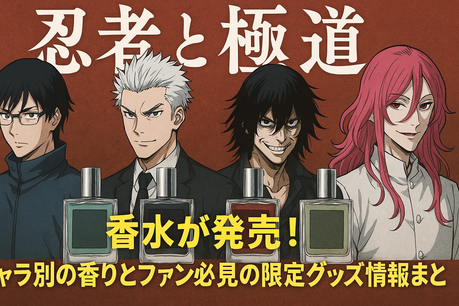 アニメ『忍者と極道』が、いま“香り”でも世界を斬る。2025年秋のアニメ放送と同時に、再び注目を集めているのが——Linkstarsが手掛けた公式キャラクターフレグランス。多仲忍者、輝村極道、殺島飛露鬼、病田色……あの4人の息遣いを、香水というかたちで閉じ込めたファン垂涎の一品だ。