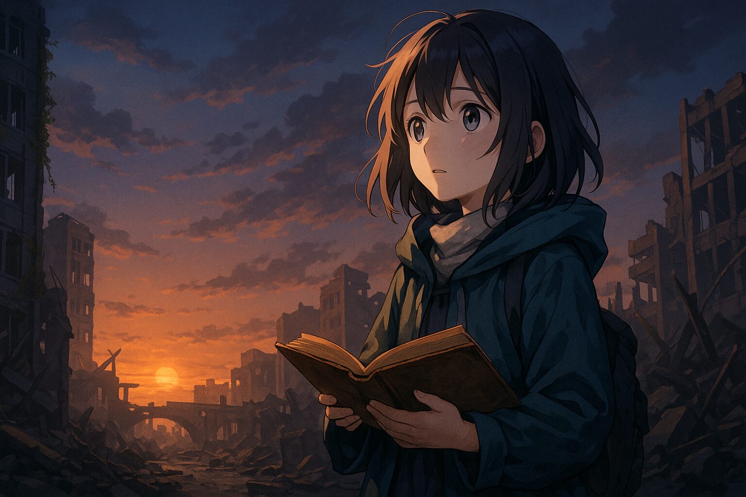 アモルが旅をしている世界は、文明が崩壊した後の静かな残響のような場所だ。空は常に夕焼け色で、朝も夜も訪れない。そう、“ユウグレ”が止まっている。彼女が“禁書の絵本”を探す理由も、この止まった時間の中で「語ること」を取り戻すためなんだ。つまり、この作品における“夕暮れ”とは、**世界の更新が止まった状態=物語が進まない時間**のメタファーになっている。