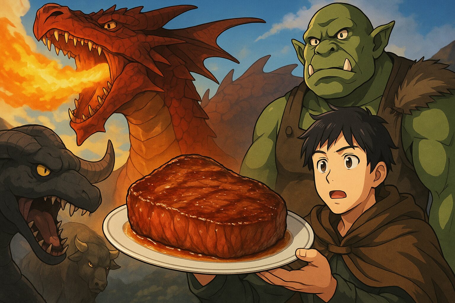 『とんでもスキルで異世界放浪メシ』が面白いのは、物語が終わった後にも“食の議論”が続くことだ。中でもファンの間で話題となったのが、「レッドドラゴン=和牛説」。──強敵レッドドラゴンを倒して焼いたステーキ、その脂のきめ細かさと旨味の描写が、まるでA5ランク和牛そのものだと語られている。