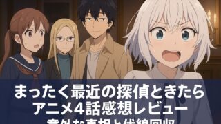 まったく最近の探偵ときたら まったく最近の探偵ときたら アニメ3話感想レビュー|新キャラ登場と人間関係の変化 探偵アニメの中でも異彩を放つ『まったく最近の探偵ときたら』。第3話は、新キャラ・アスナロの登場によって物語が大きく揺れ動きました。 笑いとテンポの良さで魅せるこの作品ですが、今回はそれだけでは終わらない。キャラクター同士の微妙な距離感や、過... 2025.08.22 まったく最近の探偵ときたら